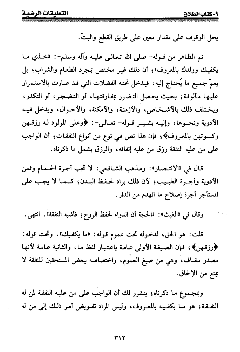 ثم الظاهر من قوله - صلى الله عليه وسلم -: " خذي ما يكفيك وولدك بالمعروف "؛ أن ذلك غير مختص بمجرد الطعام والشراب؛ بل يعم جميع ما يُحتاج إليه، فيدخل تحته الفضلات التي قد صارت بالاستمرار عليها مألوفة؛ بحيث يحصل التضرر بمفارقتها، أو التضجر، أو التكدر، ويختلف ذلك بالأشخاص، والأزمنة، والأمكنة، والأحوال، ويدخل فيه الأدوية ونحوها، وإليه يشير قوله - تعالى -: {وعلى المولود له رزقهن وكسوتهن بالمعروف} ؛ فإن هذا نص في نوع من أنواع النفقات؛ أن الواجب على من عليه النفقة رزق من عليه إنفاقه، والرزق يشمل ما ذكرناه.