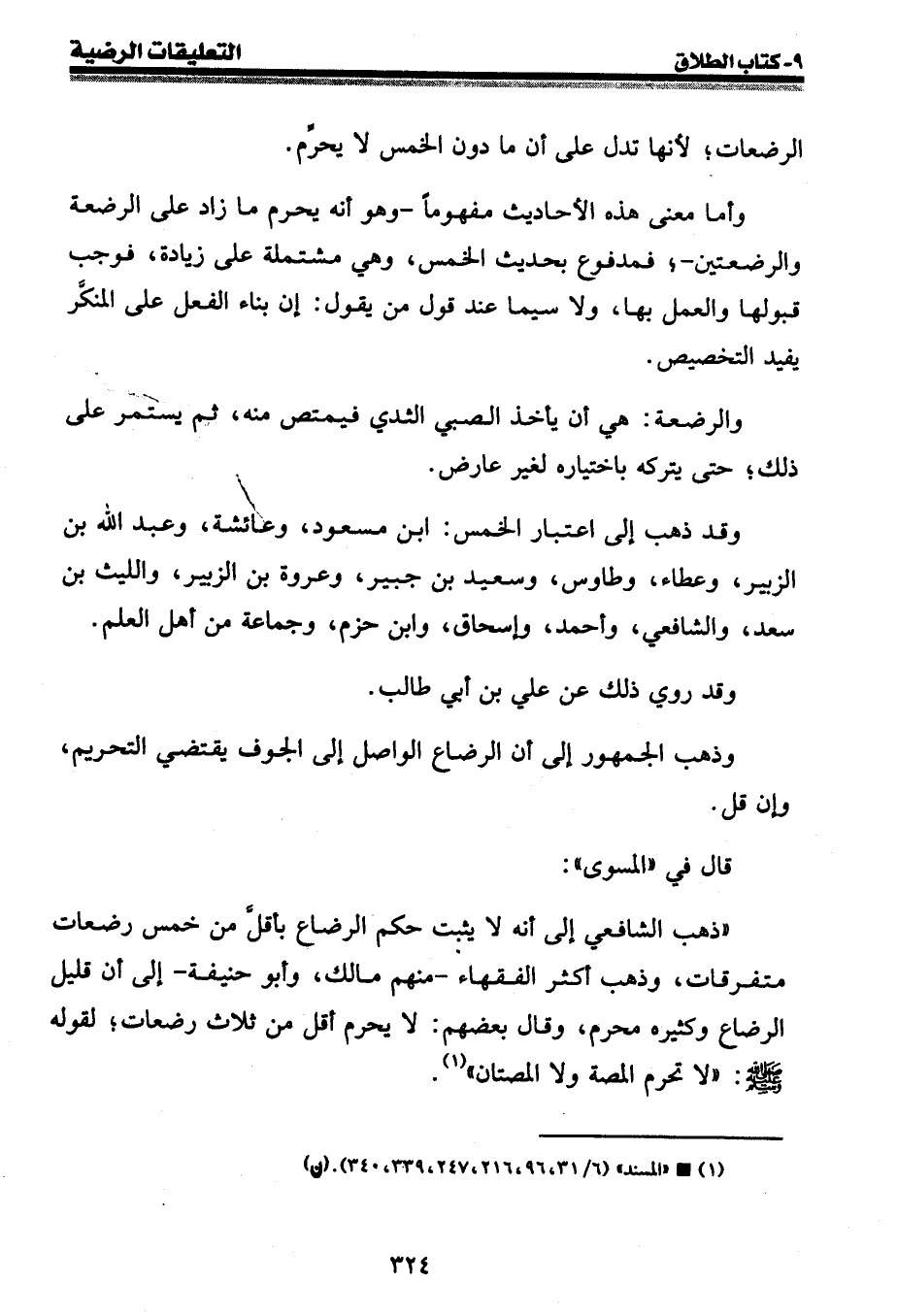 " ذهب الشافعي إلى أنه لا يثبت حكم الرضاع بأقل من خمس رضعات متفرقات، وذهب أكثر الفقهاء - منهم مالك، وأبو حنيفة - إلى أن قليل الرضاع وكثيره محرم، وقال بعضهم: لا يحرم أقل من ثلاث رضعات؛ لقوله صلى الله عليه وسلم: " لا تحرم المصة ولا المصتان " (¬1) .