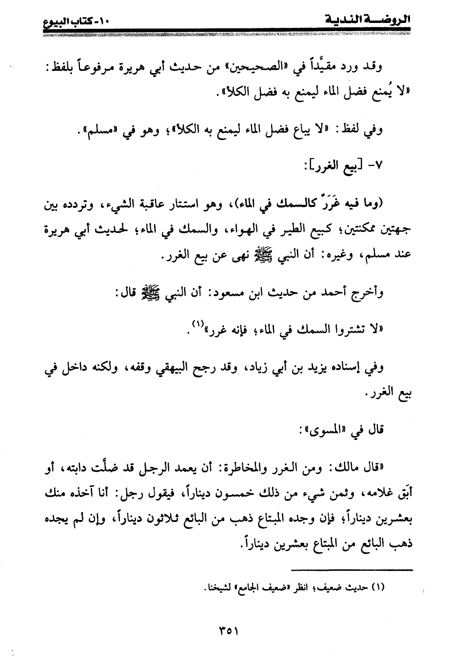 (وما فيه غرر كالسمك في الماء) ، وهو استتار عاقبة الشيء، وتردده بين جهتين ممكنتين؛ كبيع الطير في الهواء، والسمك في الماء؛ لحديث أبي هريرة عند مسلم، وغيره: أن النبي صلى الله عليه وسلم نهى عن بيع الغرر.