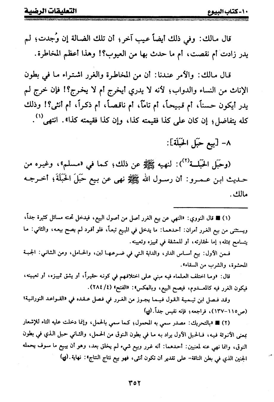 (¬2) • " بالتحريك: مصدر سمي به المحمول؛ كما سمي بالحمل، وإنما دخلت عليه التاء للإشعار بمعنى الأنوثة فيه، فالحبل الأول يراد به ما في بطون النوق من الحمل، والثاني حبل الذي في بطون النوق، وإنما نهي عنه لمعنيين: أحدهما: أنه غرر وبيع شيء لم يخلق بعد، وهو أن يبيع ما سوف يحمله الجنين الذي في بطن الناقة - على تقدير أن تكون أنثى، فهو بيع نتاج النتاج ": نهاية. (ن)
