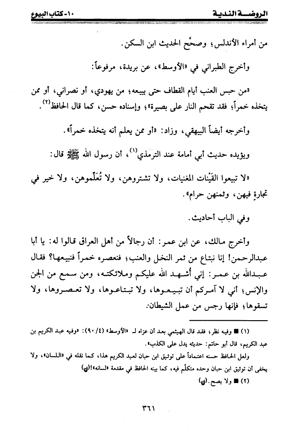 وأخرج مالك، عن ابن عمر: أن رجالا من أهل العراق قالوا له: يا أبا عبد الرحمن {إنا نبتاع من ثمر النخل والعنب؛ فنعصره خمرا فنبيعها؟ فقال عبد الله بن عمر: إني أشهد الله عليكم وملائكته، ومن سمع من الجن والإنس؛ أني لا آمركم أن تبيعوها، ولا تبتاعوها، ولا تعصروها، ولا تسقوها؛ فإنها رجس من عمل الشيطان.