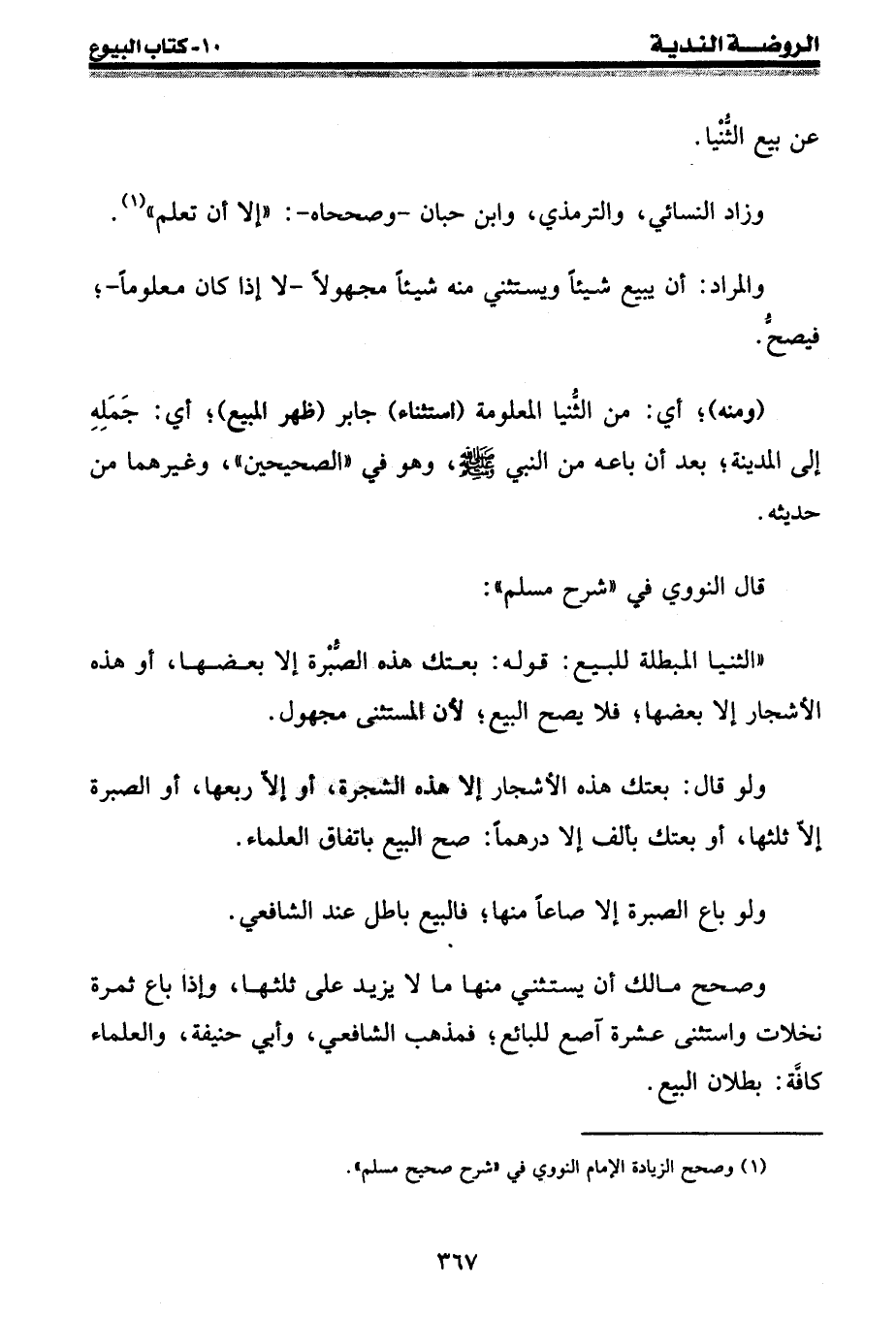" الثنيا المبطلة للبيع: قوله: بعتك هذه الصبرة إلا بعضها، أو هذه الأشجار إلا بعضها؛ فلا يصح البيع؛ لأن المستثنى مجهول.