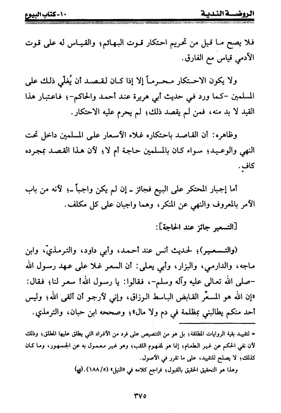 (والتسعير) ؛ لحديث أنس عند أحمد، وأبي داود، والترمذي، وابن ماجه، والدارمي، والبزار، وأبي يعلى: أن السعر غلا على عهد رسول الله - صلى الله عليه وسلم -، فقالوا: يا رسول الله! سعر لنا؛ فقال: " إن الله هو المسعر القابض الباسط الرزاق، وإني لأرجو أن ألقى الله، وليس أحد منكم يطالبني بمظلمة في دم ولا مال "؛ وصححه ابن حبان، والترمذي.