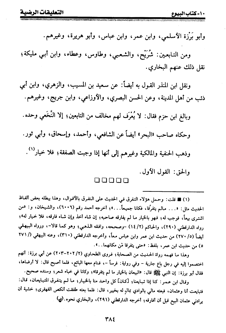 (¬1) • قلت: وحمل هؤلاء التفرق في الحديث على التفرق بالأقوال، وهذا يبطله بعض ألفاظ الحديث مثل: " ... ما لم يتفرقا، فكانا جميعا ... "؛ أخرجه أحمد رقم (6006) ، والشيخان، و: " من اشترى بيعا، فوجب له؛ فهو بالخيار ما لم يفارقه صاحبه؛ إن شاء أخذ وإن شاء فارقه، فلا خيار له "؛ رواه الدارقطني (290) ، والحاكم (2 / 14) - وصححه، وافقه الذهبي؛ وهو كما قالا -، ورواه البيهقي أيضا (5 / 270) من حديث ابن عمر وابن عباس معا، وأخرجه الدارقطني (310) ، وعنه البيهقي (/ 271 5) من حديث ابن عمر، بلفظ: " حتى يتفرقا من مكانهما. . ".