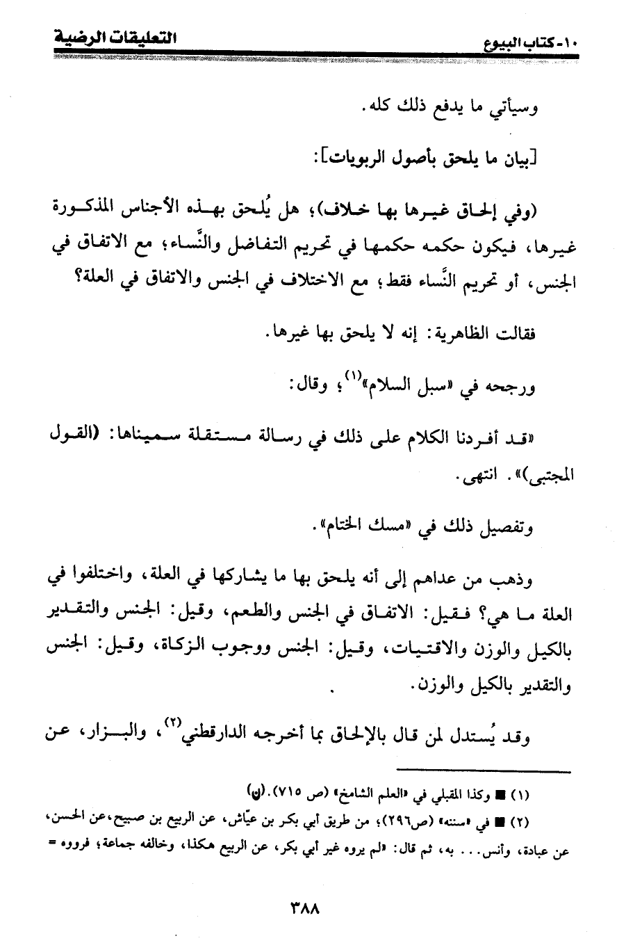 (وفي إلحاق غيرها بها خلاف) ؛ هل يلحق بهذه الأجناس المذكورة غيرها، فيكون حكمه حكمها في تحريم التفاضل والنساء؛ مع الاتفاق في الجنس، أو تحريم النساء فقط؛ مع الاختلاف في الجنس والاتفاق في العلة؟