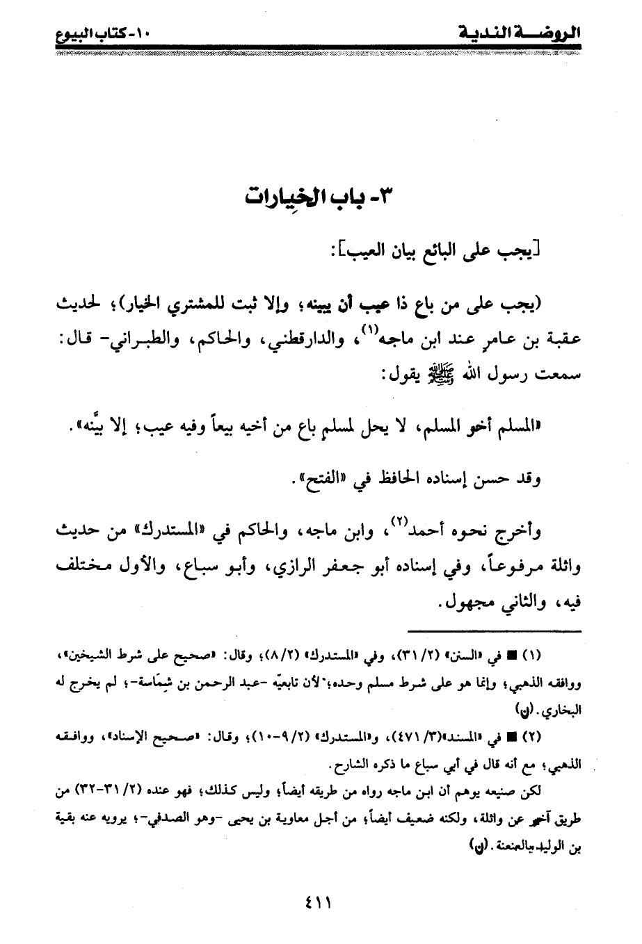 (يجب على من باع ذا عيب أن يبينه؛ وإلا ثبت للمشتري الخيار) ؛ لحديث عقبة بن عامر عند ابن ماجه (¬1) ، والدارقطني، والحاكم، والطبراني - قال: سمعت رسول الله صلى الله عليه وسلم يقول: