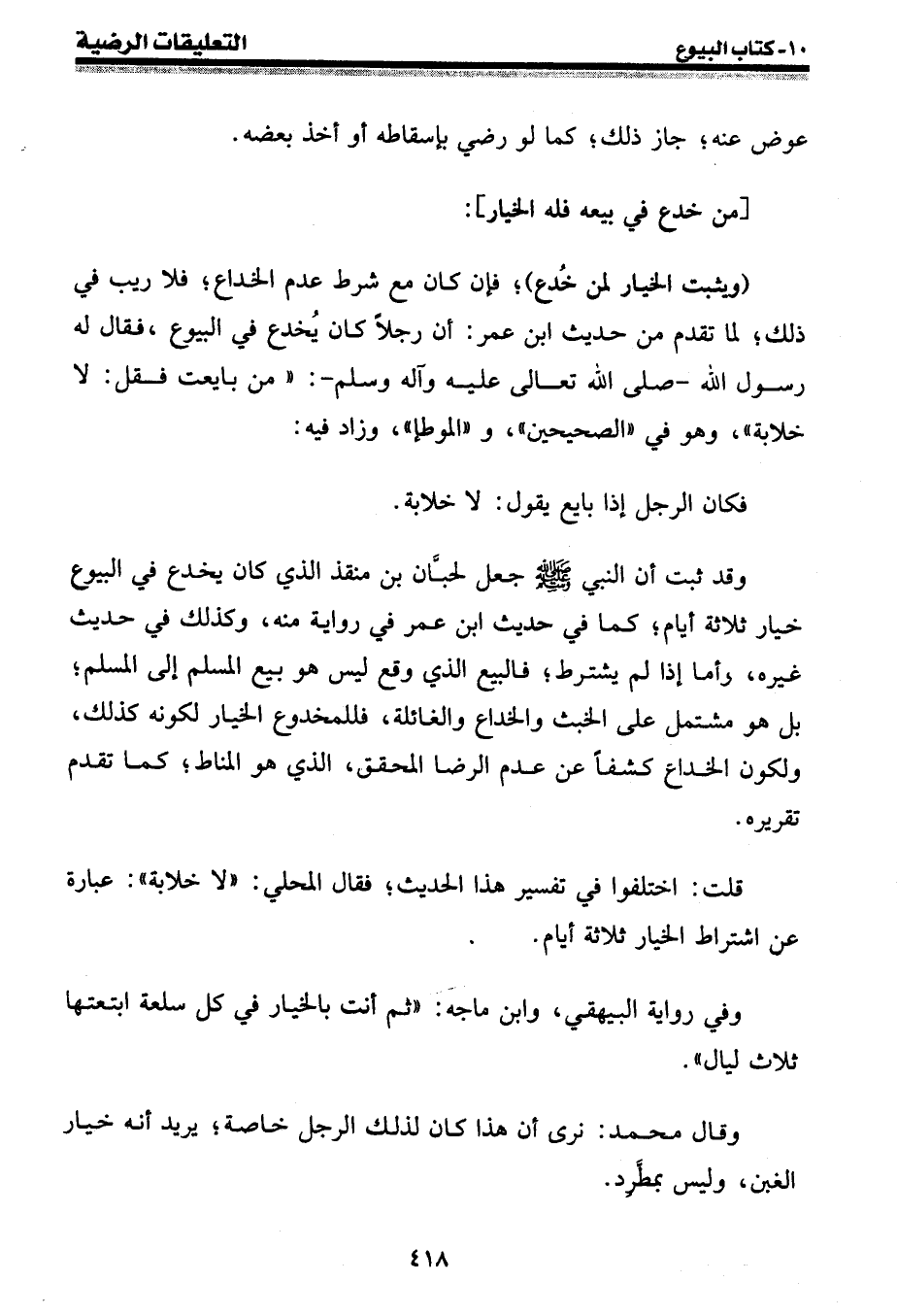 وقد ثبت أن النبي صلى الله عليه وسلم جعل لحبان بن منقذ الذي كان يخدع في البيوع خيار ثلاثة أيام؛ كما في حديث ابن عمر في رواية منه، وكذلك في حديث غيره، وأما إذا لم يشترط؛ فالبيع الذي وقع ليس هو بيع المسلم إلى المسلم؛ بل هو مشتمل على الخبث والخداع والغائلة، فللمخدوع الخيار لكونه كذلك، ولكون الخداع كشفا عن عدم الرضا المحقق، الذي هو المناط؛ كما تقدم تقريره.