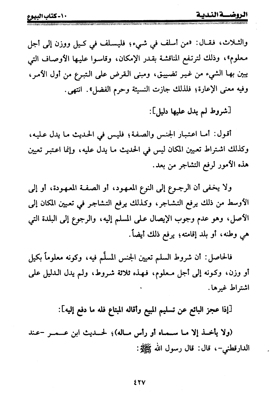 فالحاصل: أن شروط السلم تعيين الجنس المسلم فيه؛ وكونه معلوما بكيل أو وزن، وكونه إلى أجل معلوم، فهذه ثلاثة شروط، ولم يدل الدليل على اشتراط غيرها.