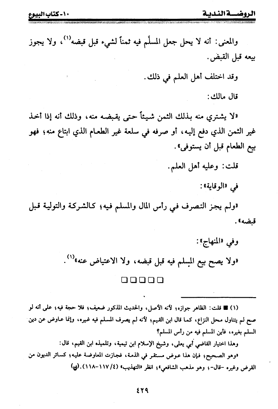 (¬1) • قلت: الظاهر جوازه؛ لأنه الأصل، والحديث المذكور ضعيف؛ فلا حجة فيه؛ على أنه لو صح لم يتناول محل النزاع، كما قال ابن القيم؛ لأنه لم يصرف المسلم فيه غيره، وإنما عاوض عن دين السلم بغيره، فأين المسلم فيه من رأس المسلم؟