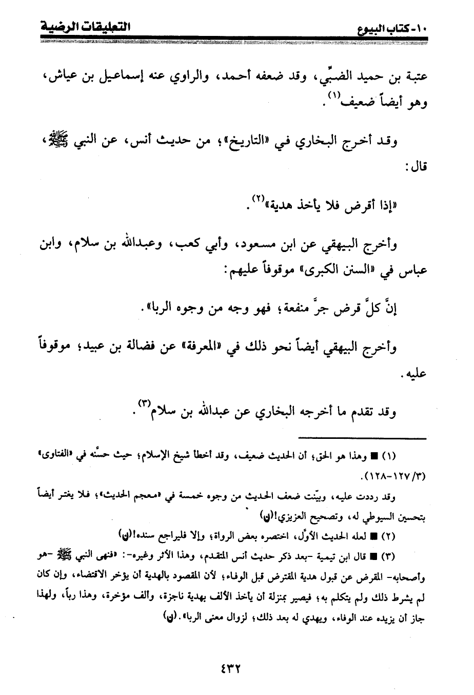 (¬3) • قال ابن تيمية - بعد ذكر حديث أنس المتقدم، وهذا الأثر وغيره -: " فنهى النبي صلى الله عليه وسلم - هو وأصحابه - المقرض عن قبول هدية المقترض قبل الوفاء؛ لأن المقصود بالهدية أن يؤخر الاقتضاء، وإن كان لم يشرط ذلك ولم يتكلم به؛ فيصير بمنزلة أن يأخذ الألف بهدية ناجزة، وألف مؤخرة، وهذا ربا، ولهذا جاز أن يزيده عند الوفاء، ويهدي له بعد ذلك؛ لزوال معنى الربا ". (ن)