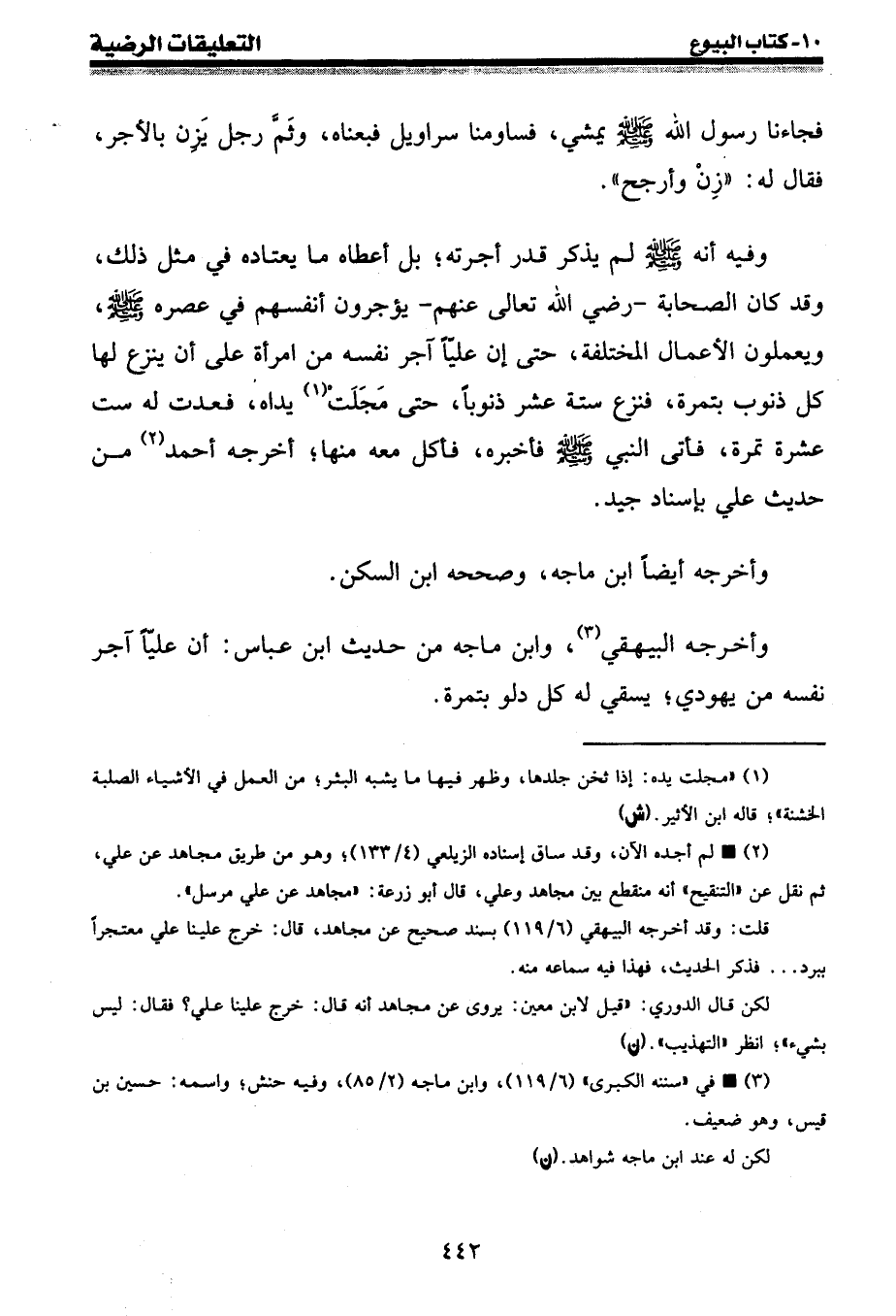 وفيه أنه صلى الله عليه وسلم لم يذكر قدر أجرته؛ بل أعطاه ما يعتاده في مثل ذلك، وقد كان الصحابة - رضي الله تعالى عنهم - يؤجرون أنفسهم في عصره صلى الله عليه وسلم، ويعملون الأعمال المختلفة، حتى إن عليا آجر نفسه من امرأة على أن ينزع لها كل ذنوب بتمرة، فنزع ستة عشر ذنوبا، حتى مجلت (¬1) يداه، فعدت له ست عشرة تمرة، فأتى النبي صلى الله عليه وسلم فأخبره، فأكل معه منها؛ أخرجه أحمد (¬2) من حديث علي بإسناد جيد.