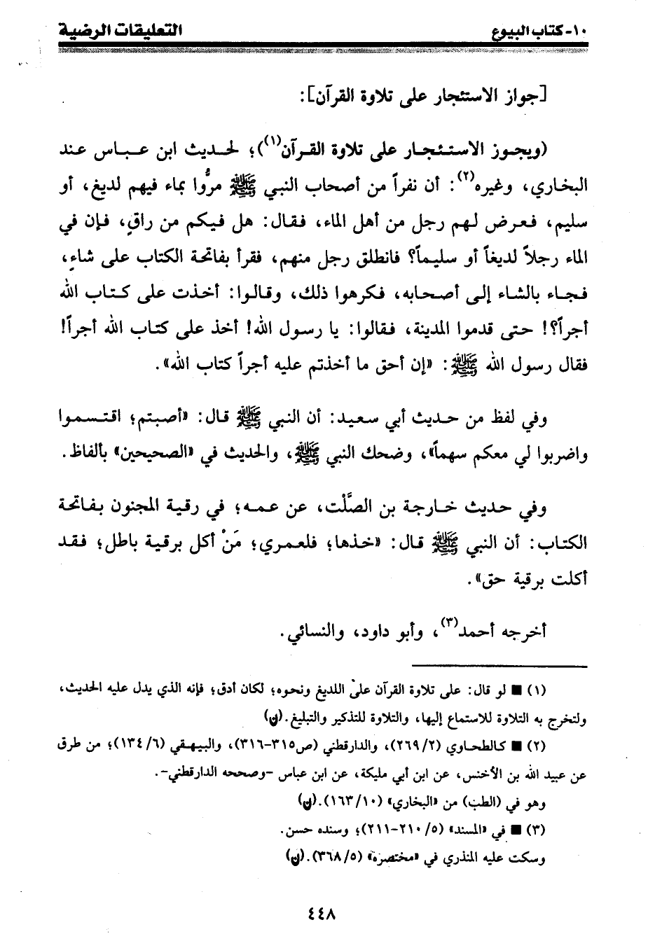 (¬1) • لو قال: على تلاوة القرآن على اللديغ ونحوه؛ لكان أدق؛ فإنه الذي يدل عليه الحديث، ولتخرج به التلاوة للاستماع إليها، والتلاوة للتذكير والتبليغ. (ن)