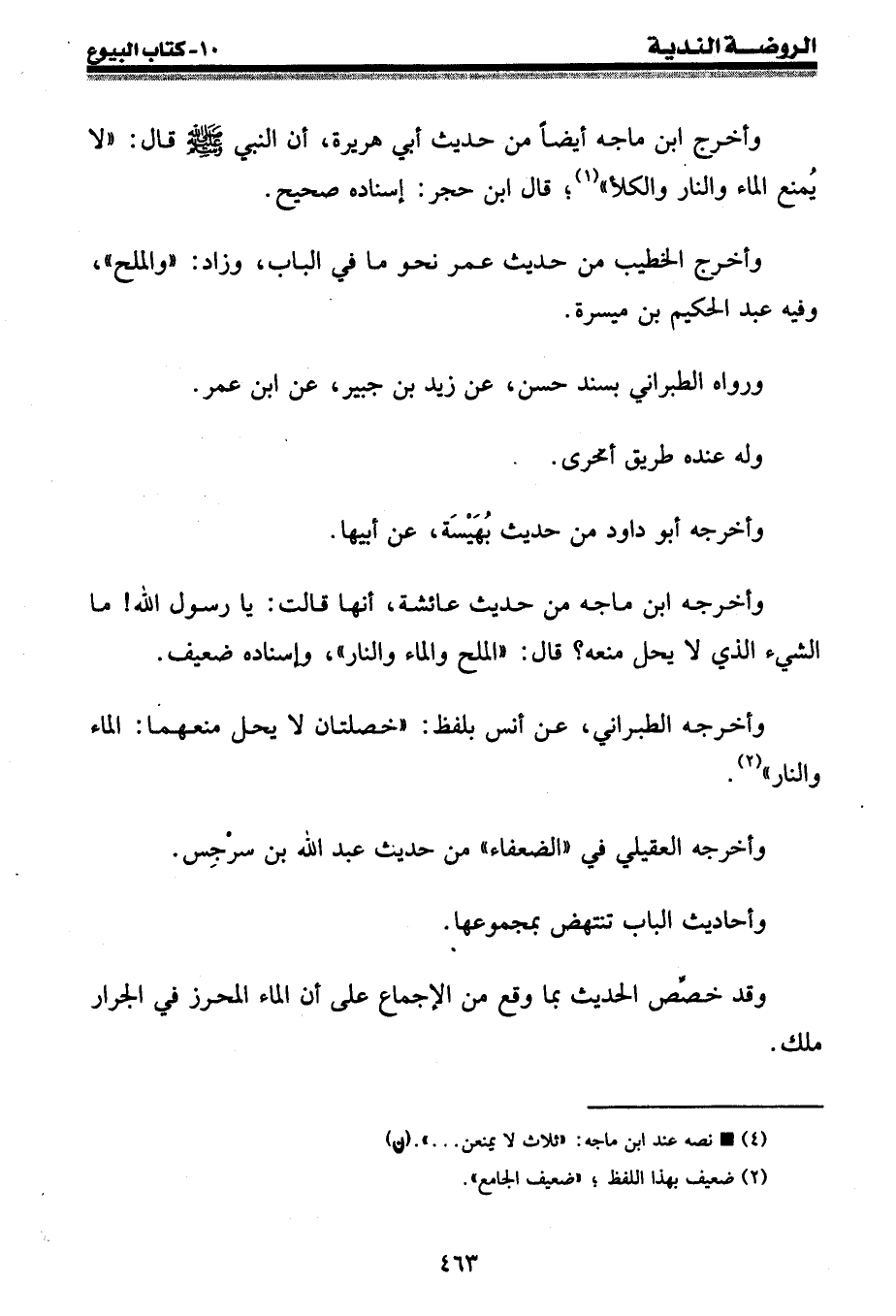 وأخرج ابن ماجه أيضا من حديث أبي هريرة، أن النبي صلى الله عليه وسلم قال: " لا يُمنع الماء والنار والكلأ " (¬1) ؛ قال ابن حجر: إسناده صحيح.