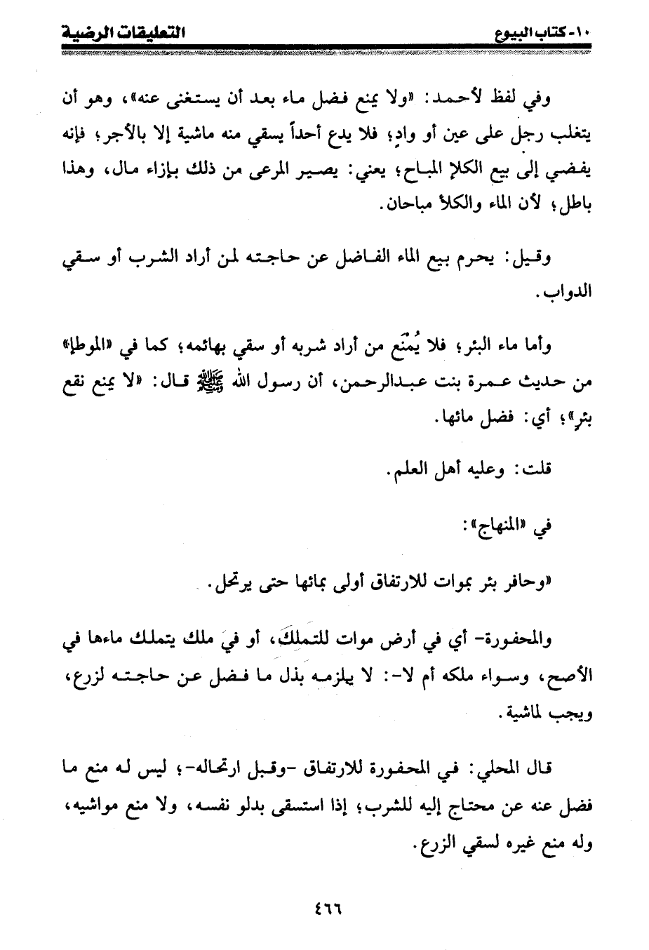 وأما ماء البئر؛ فلا يُمنع من أراد شربه أو سقي بهائمه؛ كما في " الموطإ " من حديث عمرة بنت عبد الرحمن، أن رسول الله صلى الله عليه وسلم قال: " لا يمنع نقع بئر "؛ أي: فضل مائها.