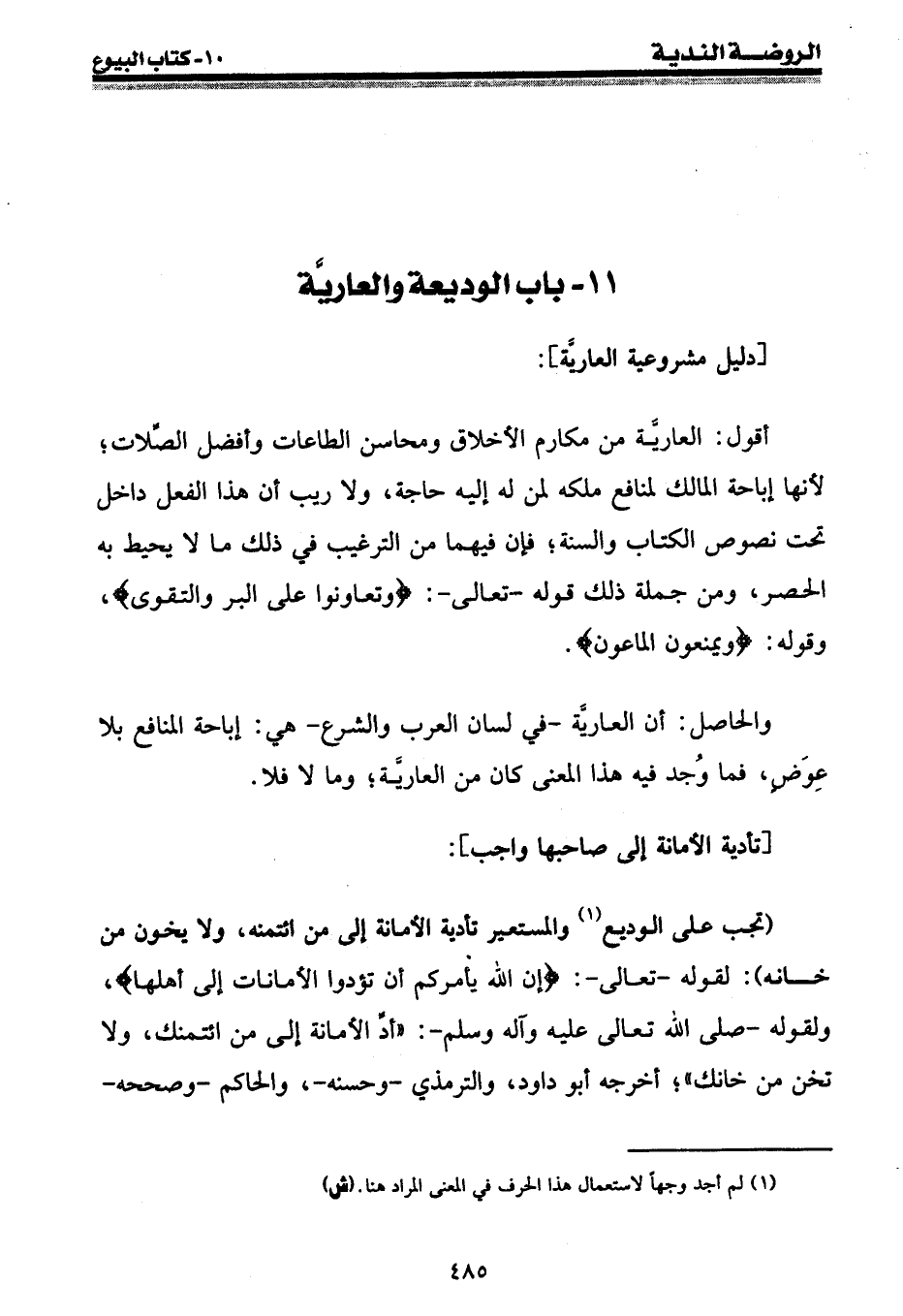 أقول: العارية من مكارم الأخلاق ومحاسن الطاعات وأفضل الصلات؛ لأنها إباحة المالك لمنافع ملكه لمن له إليه حاجة، ولا ريب أن هذا الفعل داخل تحت نصوص الكتاب والسنة؛ فإن فيهما من الترغيب في ذلك ما لا يحيط به الحصر، ومن جملة ذلك قوله - تعالى -: {وتعانوا على البر والتقوى} ، وقوله: {ويمنعون الماعون} .