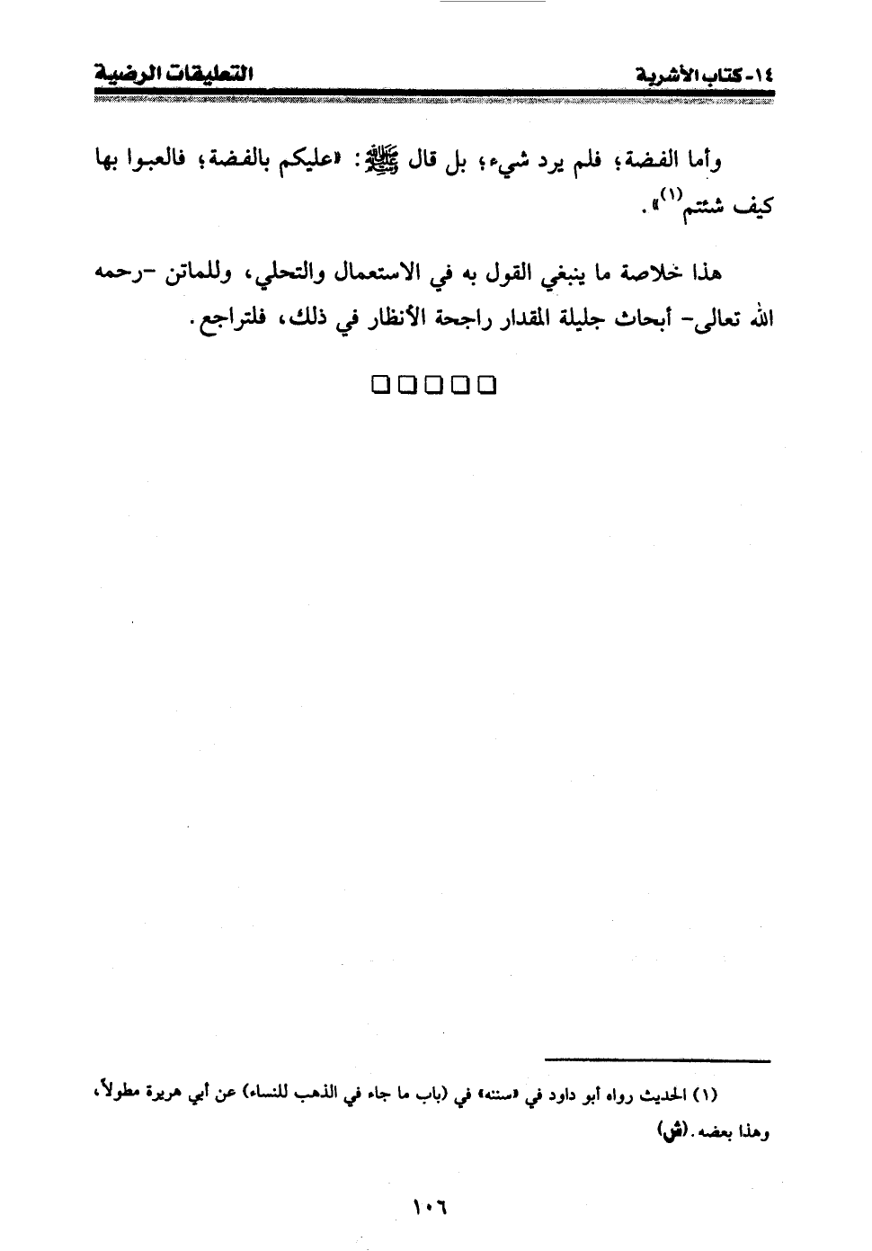 وأما الفضة؛ فلم يرد شيء؛ بل قال صلى الله عليه وسلم: " عليكم بالفضة؛ فالعبوا بها كيف شئتم (¬1) ".