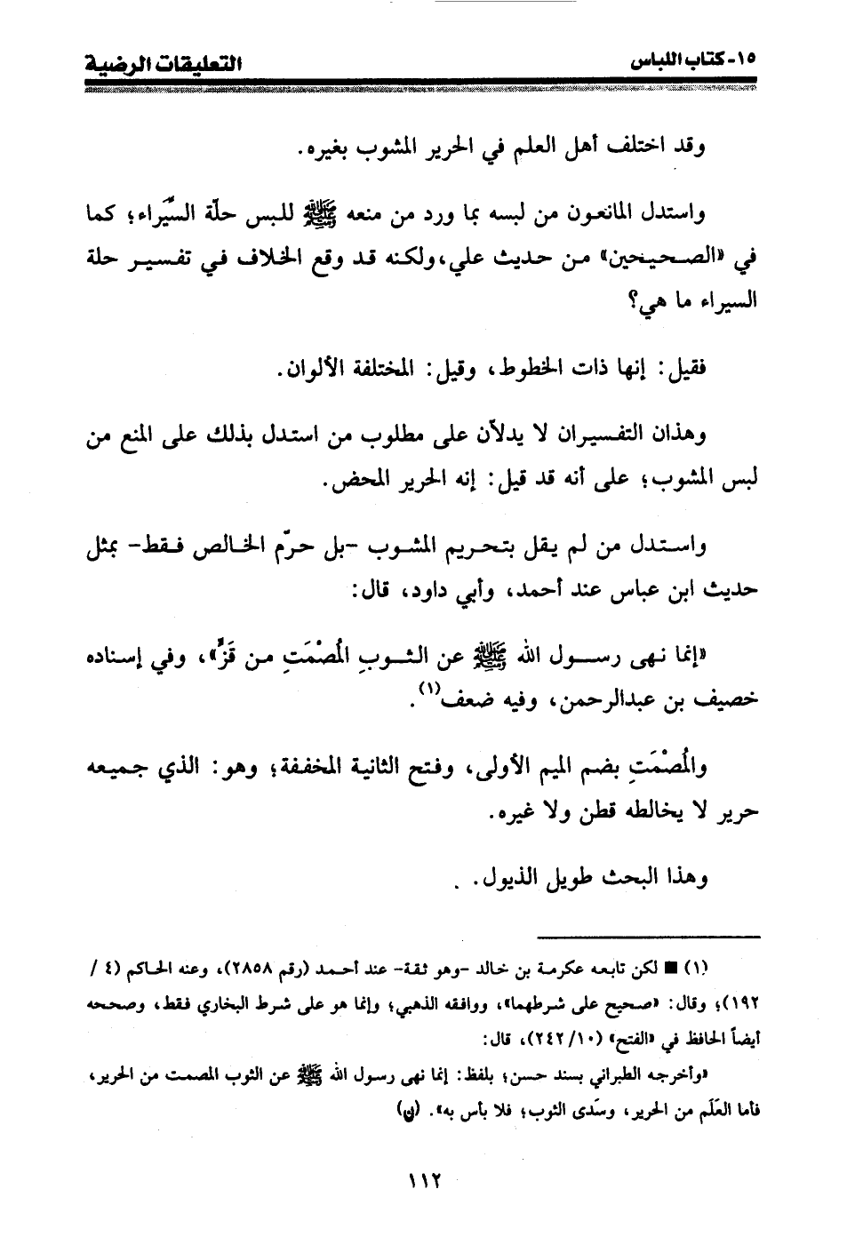 " وأخرجه الطبراني بسند حسن؛ بلفظ: إنما نهى رسول الله عن الثوب المصمت من الحرير، فأما العلم من الحرير، وسدى الثوب؛ فلا بأس به ". (ن)