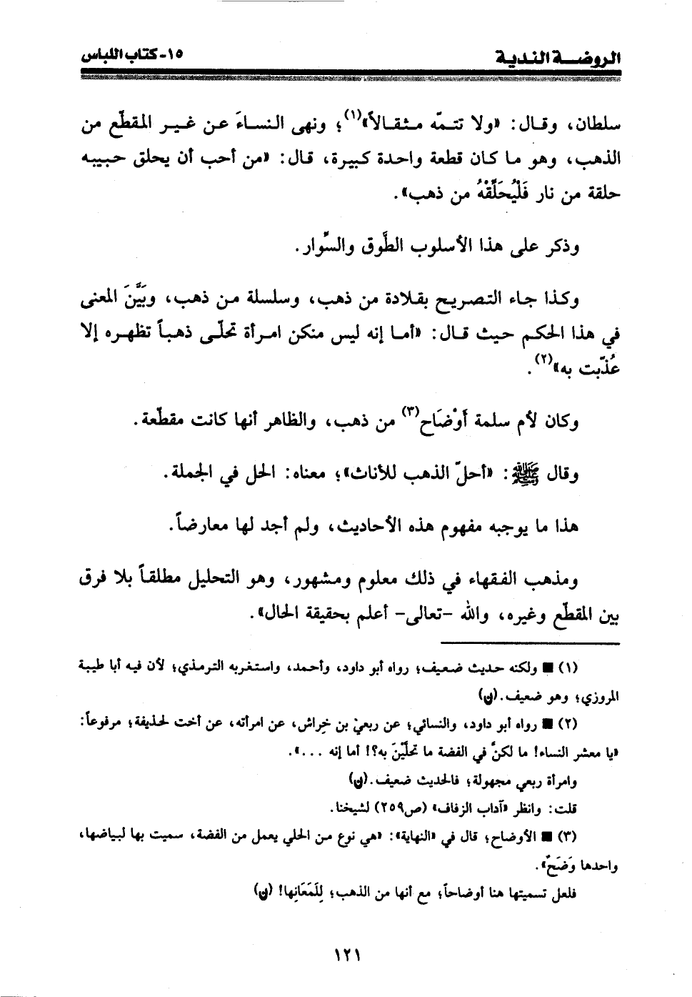 (¬2) • رواه أبو داود، والنسائي؛ عن ربعي بن خراش، عن امرأته، عن أخت لحذيفة؛ مرفوعا: " يا معشر النساء {ما لكن في الفضة ما تحلين به؟} أما إنه ... . ".