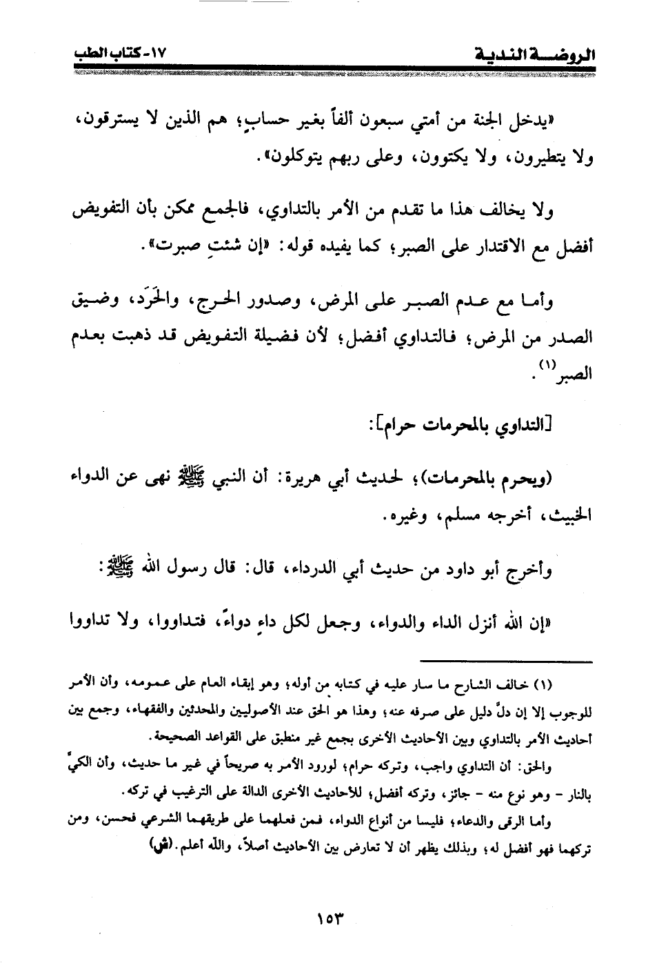 والحق: أن التداوي واجب، وتركه حرام؛ لورود الأمر به صريحا في غير ما حديث، وأن الكي بالنار - وهو نوع منه - جائز، وتركه أفضل؛ للأحاديث الأخرى الدالة على الترغيب في تركه.