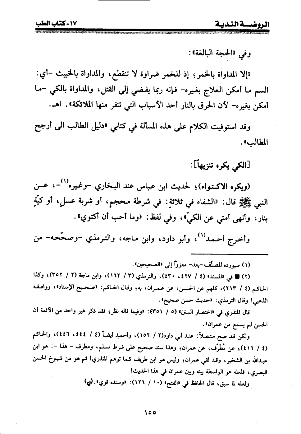 " إلا المداواة بالخمر؛ إذ للخمر ضراوة لا تنقطع، والمداواة بالخبيث - أي: السم ما أمكن العلاج بغيره - فإنه ربما يفضي إلى القتل، والمداواة بالكي - ما أمكن بغيره - لأن الحرق بالنار أحد الأسباب التي تنفر منها الملائكة ". اه.