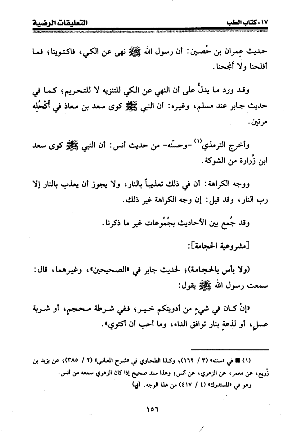 حديث عمران بن حصين: أن رسول الله صلى الله عليه وسلم نهى عن الكي، فاكتوينا؛ فما أفلحنا ولا أنجحنا.