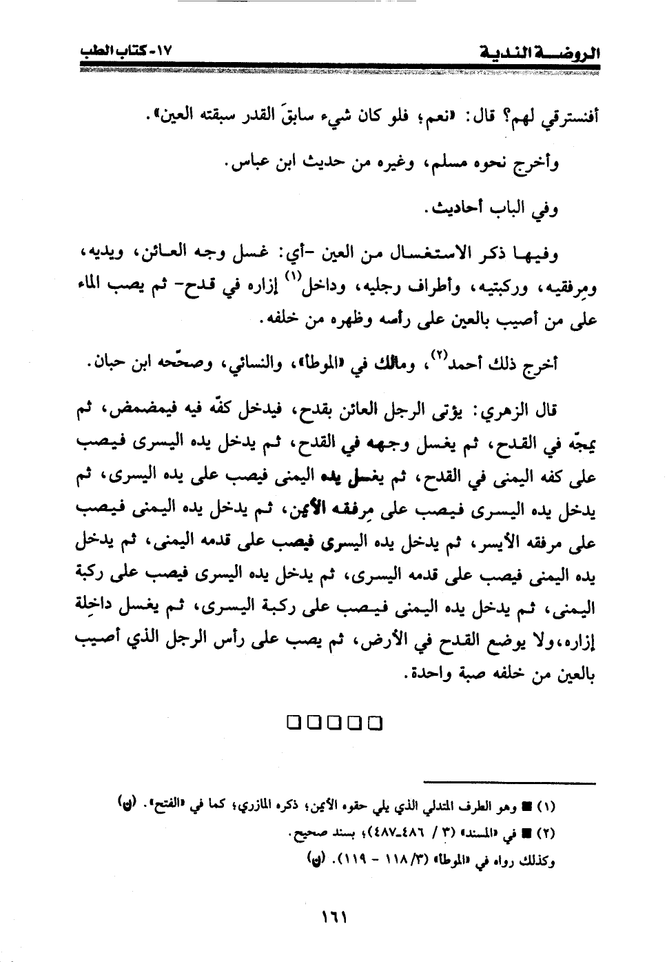 وفيها ذكر الاستغسال من العين - أي: غسل وجه العائن، ويديه، ومرفقيه، وركبتيه، وأطراف رجليه، وداخل (¬1) إزاره في قدح - ثم يصب الماء على من أصيب بالعين على رأسه وظهره من خلفه.