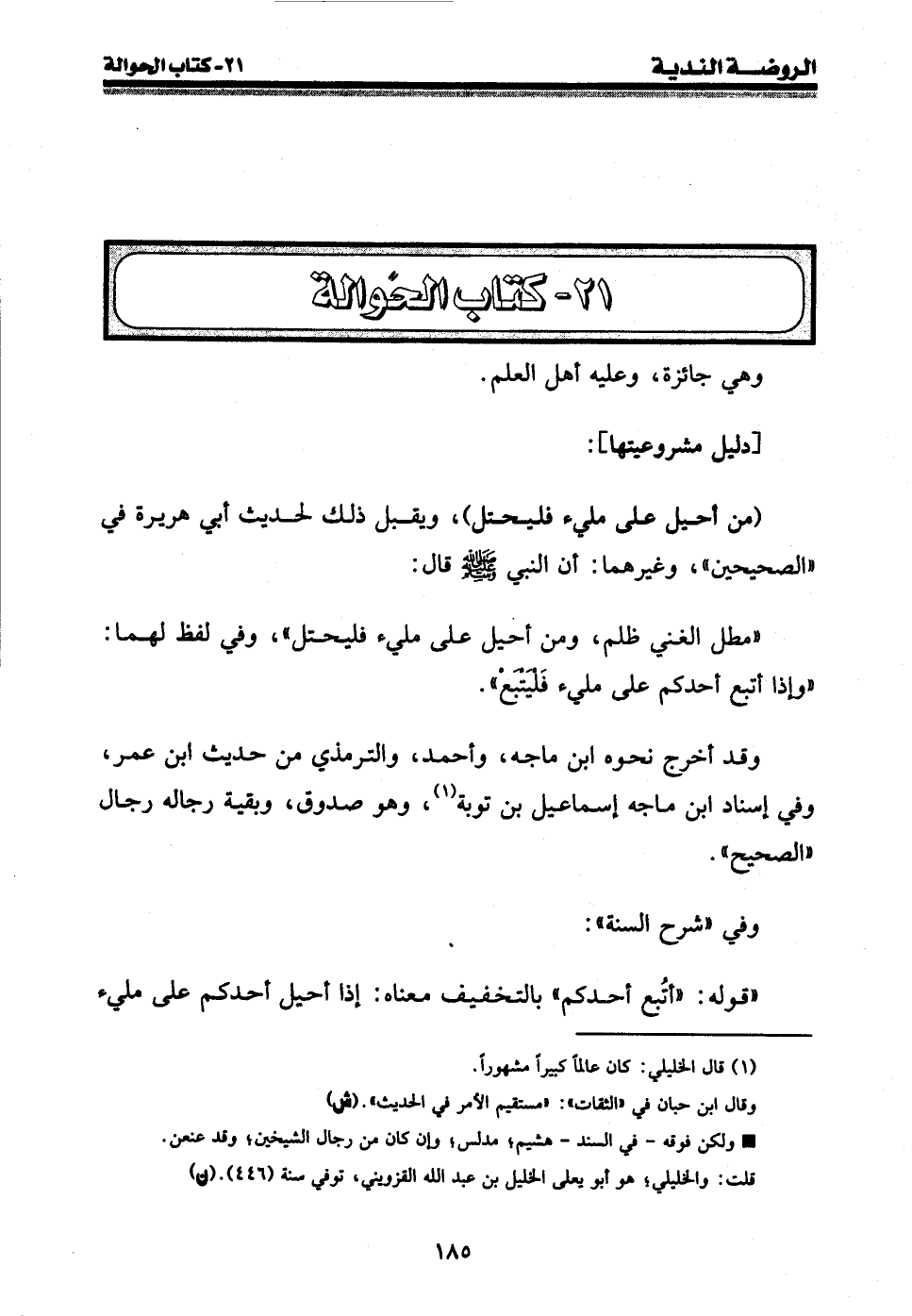 (من أحيل على مليء فليحتل) ، ويقبل ذلك لحديث أبي هريرة في " الصحيحين "، وغيرهما: أن النبي صلى الله عليه وسلم قال: