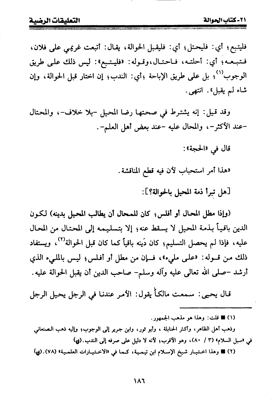 وقد قيل: إنه يشترط في صحتها رضا المحيل - بلا خلاف -، والمحتال - عند الأكثر -، والمحال عليه - عند بعض أهل العلم -.