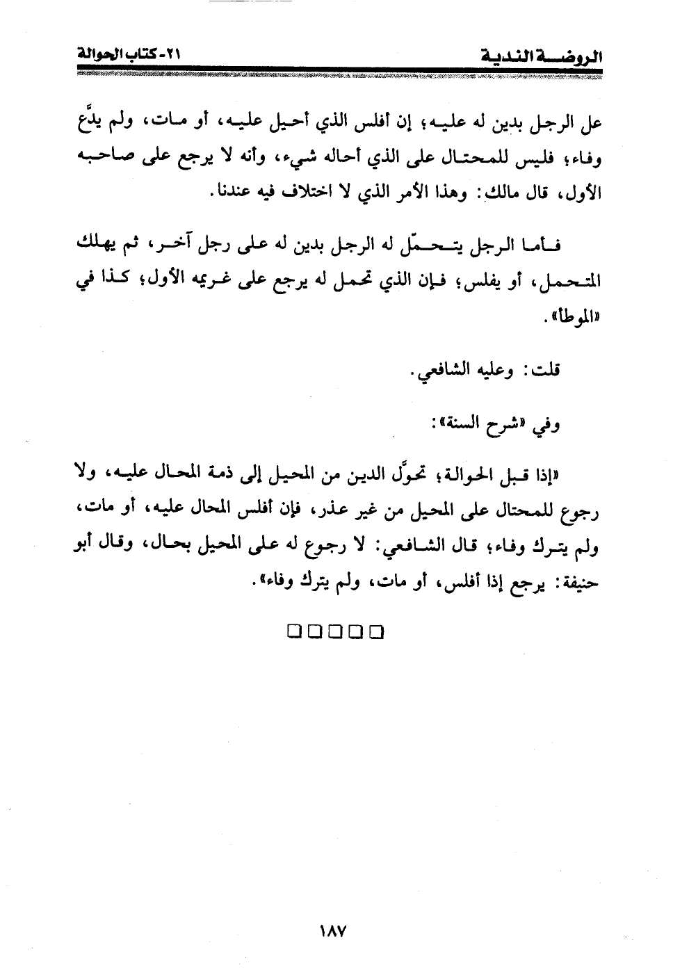 " إذا قبل الحوالة؛ تحول الدين من المحيل إلى ذمة المحال عليه، ولا رجوع للمحتال على المحيل من غير عذر، فإن أفلس المحال عليه، أو مات، ولم يترك وفاء؛ قال الشافعي: لا رجوع له على المحيل بحال، وقال أبو حنيفة: يرجع إذا أفلس، أو مات، ولم يترك وفاء ".