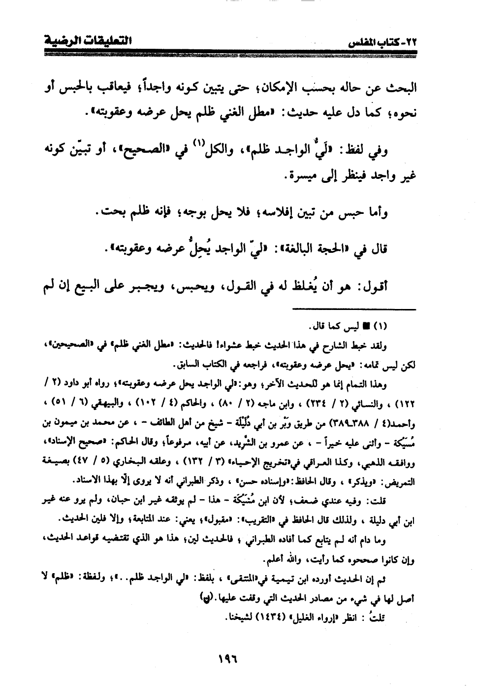 ولقد خبط الشارح في هذا الحديث خبط عشواء! فالحديث: " مطل الغني ظلم " في " الصحيحين "، لكن ليس تمامه: " يحل عرضه وعقوبته "، فراجعه في الكتاب السابق.