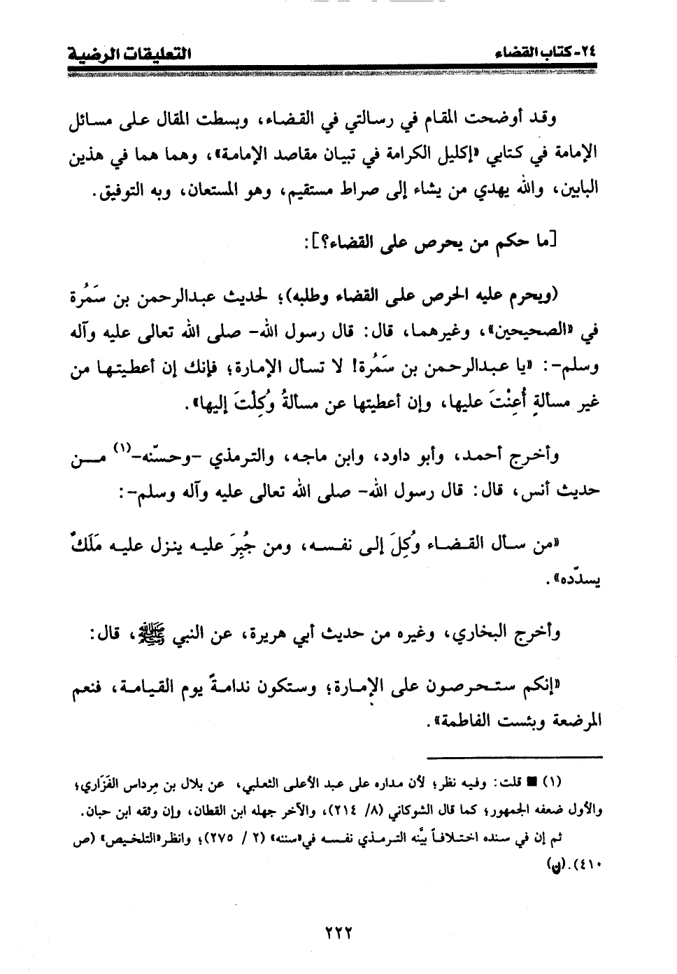 وقد أوضحت المقام في رسالتي في القضاء، وبسطت المقال على مسائل الإمامة في كتابي " إكليل الكرامة في تبيان مقاصد الإمامة "، وهما هما في هذين البابين، والله يهدي من يشاء إلى صراط مستقيم، وهو المستعان، وبه التوفيق.