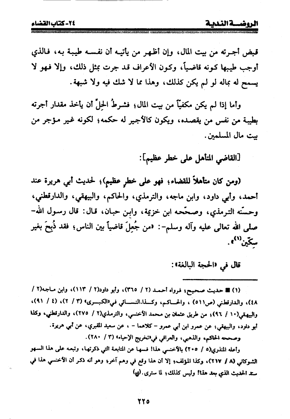 (ومن كان متأهلا للقضاء؛ فهو على خطر عظيم) ؛ لحديث أبي هريرة عند أحمد، وأبي داود، وابن ماجه، والترمذي، والحاكم، والبيهقي، والدارقطني، وحسنه الترمذي، وصححه ابن خزيمة، وابن حبان، قال: قال رسول الله - صلى الله عليه وسلم -: " من جعل قاضيا بين الناس؛ فقد ذبح بغير سكين (¬1) ".