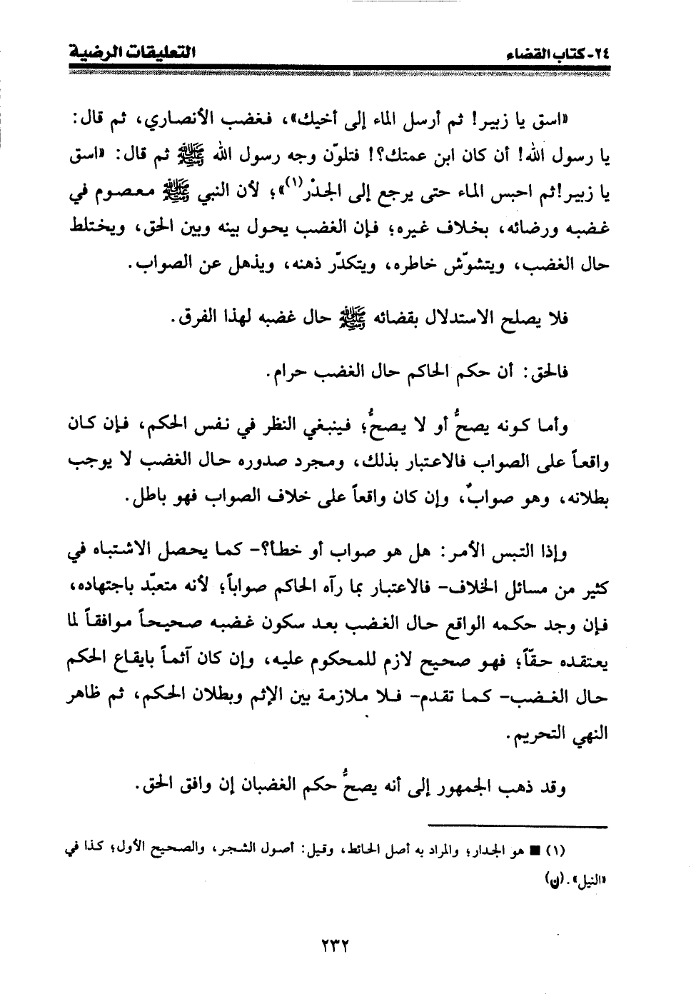" اسق يا زبير {ثم أرسل الماء إلى أخيك "، فغضب الأنصاري، ثم قال: يا رسول الله} أن كان ابن عمتك؟ {فتلون وجه رسول الله صلى الله عليه وسلم ثم قال: " اسق يا زبير} ثم احبس الماء حتى يرجع إلى الجدر (¬1) "؛ لأن النبي صلى الله عليه وسلم معصوم في غضبه ورضائه، بخلاف غيره؛ فإن الغضب يحول بينه وبين الحق، ويختلط حال الغضب، ويتشوش خاطره، ويتكدر ذهنه، ويذهل عن الصواب.