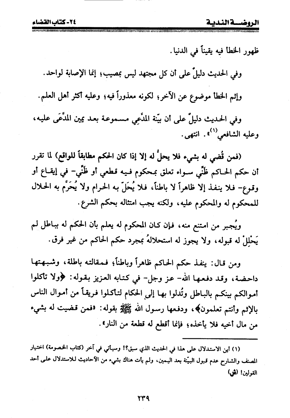 ومن قال: ينفذ حكم الحاكم ظاهرا وباطنا؛ فمقالته باطلة، وشبهتها داحضة، وقد دفعها الله - عز وجل - في كتابه العزيز بقوله: {ولا تأكلوا أموالكم بينكم بالباطل وتدلوا بها إلى الحكام لتأكلوا فريقا من أموال الناس بالإثم وأنتم تعلمون} ، ودفعها رسول الله صلى الله عليه وسلم بقوله: " فمن قضيت له بشيء من مال أخيه فلا يأخذه؛ فإنما أقطع له قطعة من النار ".