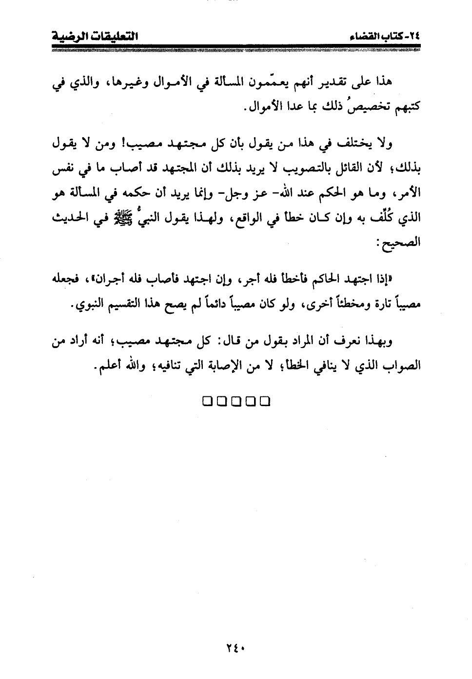 ولا يختلف في هذا من يقول بأن كل مجتهد مصيب! ومن لا يقول بذلك؛ لأن القائل بالتصويب لا يريد بذلك أن المجتهد قد أصاب ما في نفس الأمر، وما هو الحكم عند الله - عز وجل - وإنما يريد أن حكمه في المسألة هو الذي كلف به وإن كان خطأ في الواقع، ولهذا يقول النبي صلى الله عليه وسلم في الحديث الصحيح: