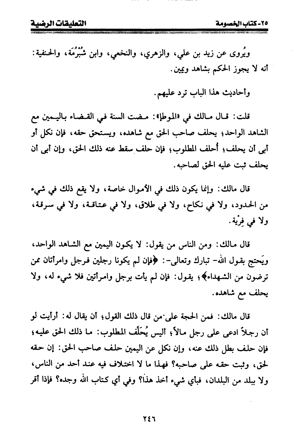 قال مالك: فمن الحجة على من قال ذلك القول؛ أن يقال له: أرأيت لو أن رجلا ادعى على رجل مالا؛ أليس يحلف المطلوب: ما ذلك الحق عليه؛ فإن حلف بطل ذلك عنه، وإن نكل عن اليمين حلف صاحب الحق: إن حقه لحق، وثبت حقه على صاحبه؟ فهذا ما لا اختلاف فيه عند أحد من الناس، ولا ببلد من البلدان، فبأي شيء أخذ هذا؟ وفي أي كتاب الله وجده؟ فإذا أقر
