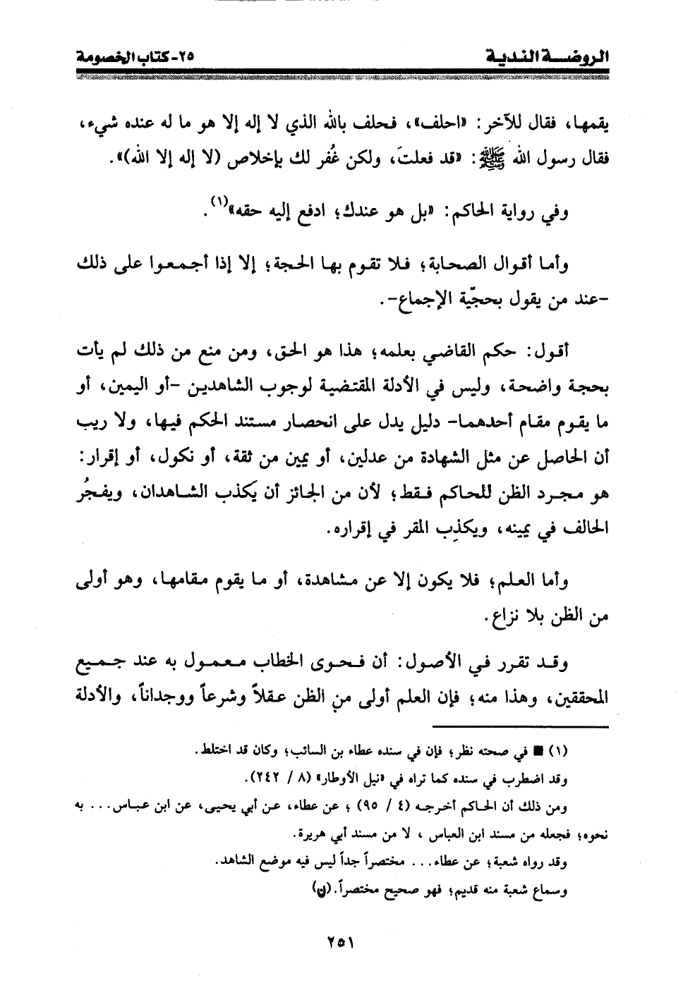 أقول: حكم القاضي بعلمه؛ هذا هو الحق، ومن منع من ذلك لم يأت بحجة واضحة، وليس في الأدلة المقتضية لوجوب الشاهدين - أو اليمين، أو ما يقوم مقام أحدهما - دليل يدل على انحصار مستند الحكم فيها، ولا ريب أن الحاصل عن مثل الشهادة من عدلين، أو يمين من ثقة، أو نكول، أو إقرار: هو مجرد الظن للحاكم فقط؛ لأن من الجائز أن يكذب الشاهدان، ويفجر الحالف في يمينه، ويكذب المقر في إقراره.