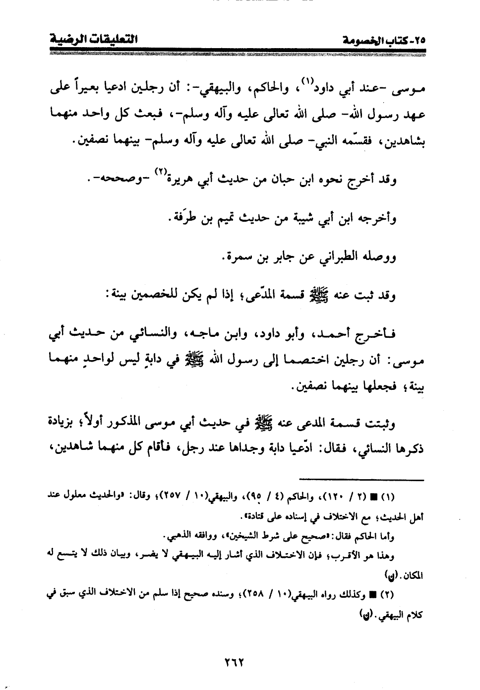 موسى - عند أبي داود (¬1) ، والحاكم، والبيهقي -: أن رجلين ادعيا بعيرا على عهد رسول الله - صلى الله عليه وسلم -، فبعث كل واحد منهما بشاهدين، فقسمه النبي - صلى الله عليه وسلم - بينهما نصفين.
