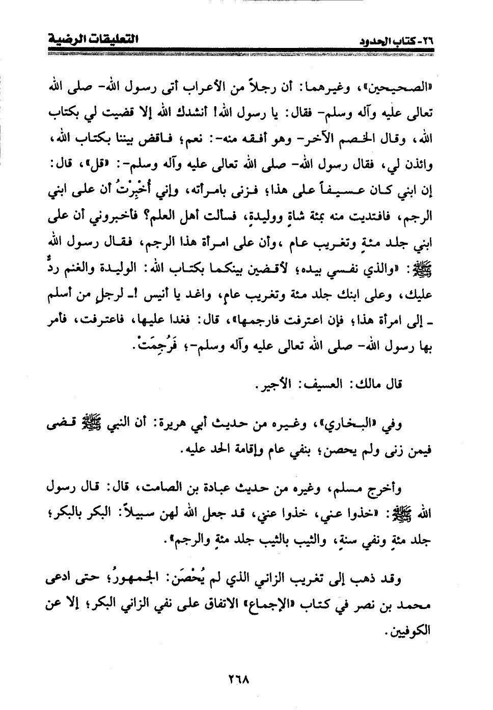 " الصحيحين "، وغيرهما: أن رجلا من الأعراب أتى رسول الله - صلى الله عليه وسلم - فقال: يا رسول الله {أنشدك الله إلا قضيت لي بكتاب الله، وقال الخصم الآخر - وهو أفقه منه -: نعم؛ فاقض بيننا بكتاب الله، وائذن لي، فقال رسول الله - صلى الله عليه وسلم -: " قل "، قال: إن ابني كان عسيفا على هذا؛ فزنى بامرأته، وإني أخبرت أن على ابني الرجم، فافتديت منه بمئة شاة ووليدة، فسألت أهل العلم؟ فأخبروني أن على ابني جلد مئة وتغريب عام، وأن على امرأة هذا الرجم، فقال رسول الله صلى الله عليه وسلم: " والذي نفسي بيده؛ لأقضين بينكما بكتاب الله: الوليدة والغنم رد عليك، وعلى ابنك جلد مئة وتغريب عام، واغد يا أنيس} - لرجل من أسلم - إلى امرأة هذا؛ فإن اعترفت فارجمهما "، قال: فغدا عليها، فاعترفت، فأمر بها رسول الله - صلى الله عليه وسلم -؛ فرجمت.