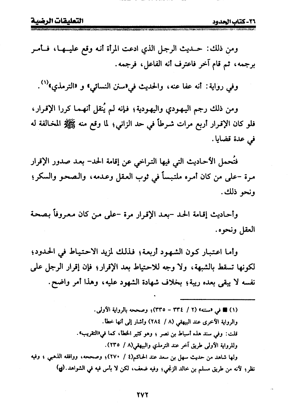 ومن ذلك رجم اليهودي واليهودية؛ فإنه لم ينقل أنهما كررا الإقرار، فلو كان الإقرار أربع مرات شرطا في حد الزاني؛ لما وقع منه صلى الله عليه وسلم المخالفة له في عدة قضايا.