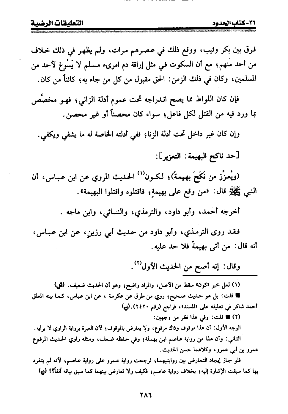 فقد روى الترمذي، وأبو داود من حديث أبي رزين، عن ابن عباس، أنه قال: من أتى بهيمة فلا حد عليه.