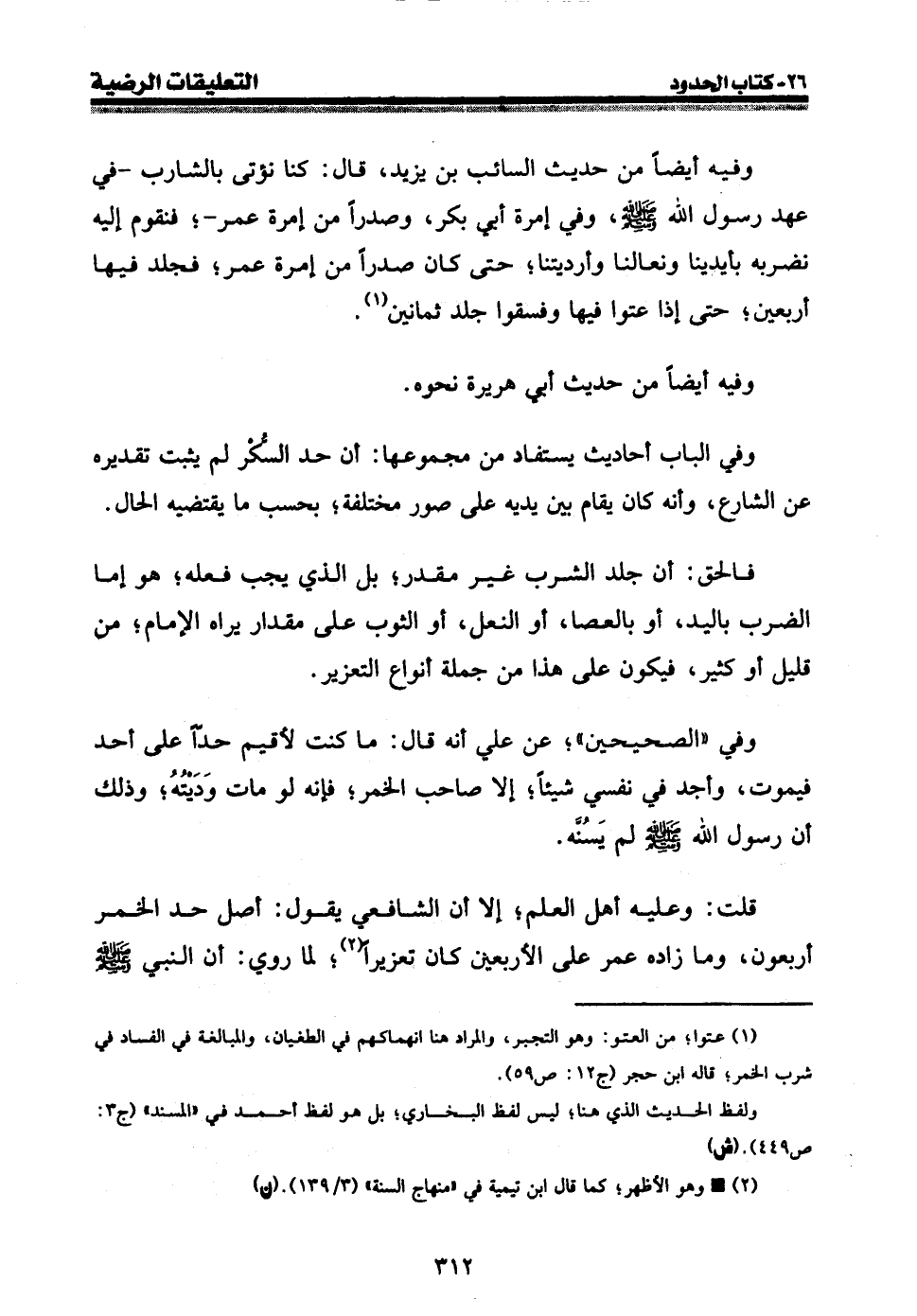 وفيه أيضا من حديث السائب بن يزيد، قال: كنا نؤتى بالشارب - في عهد رسول الله صلى الله عليه وسلم، وفي إمرة أبي بكر، وصدرا من إمرة عمر -؛ فنقوم إليه نضربه بأيدينا ونعالنا وأرديتنا؛ حتى كان صدرا من إمرة عمر؛ فجلد فيها أربعين؛ حتى إذا عتوا فيها وفسقوا جلد ثمانين (¬1) .