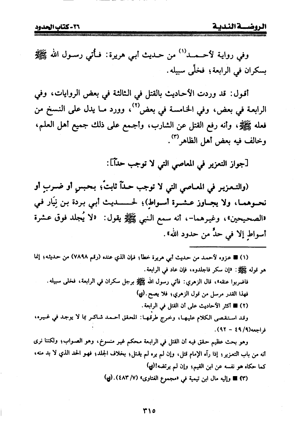 وهو بحث عظيم حقق فيه أن القتل في الرابعة محكم غير منسوخ، وهو الصواب؛ ولكننا نرى أنه من باب التعزير؛ إذا رآه الإمام قتل، وإن لم يره لم يقتل؛ بخلاف الجلد؛ فهو الحد الذي لا بد منه، كما حكاه هو نفسه عن ابن القيم؛ وإن لم يرتضه! (ن)