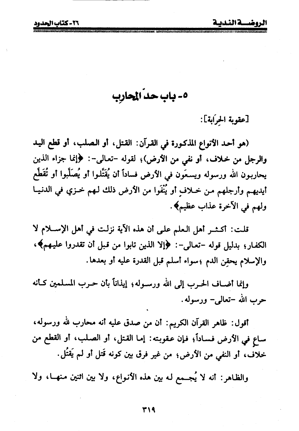 (هو أحد الأنواع المذكورة في القرآن: القتل، أو الصلب، أو قطع اليد والرجل من خلاف، أو نفي من الأرض) ؛ لقوله - تعالى -: {إنما جزاء الذين يحاربون الله ورسوله ويسعون في الأرض فسادا أن يقتلوا أو يصلبوا أو تقطع أيديهم وأرجلهم من خلاف أو ينفوا من الأرض ذلك لهم خزي في الدنيا ولهم في الآخرة عذاب عظيم} .