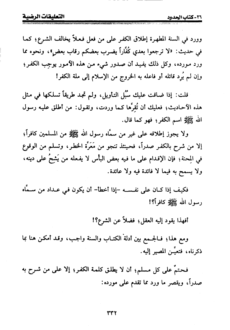 فحتم على كل مسلم؛ أن لا يطلق كلمة الكفر؛ إلا على من شرح به صدرا، ويقصر ما ورد مما تقدم على مورده: