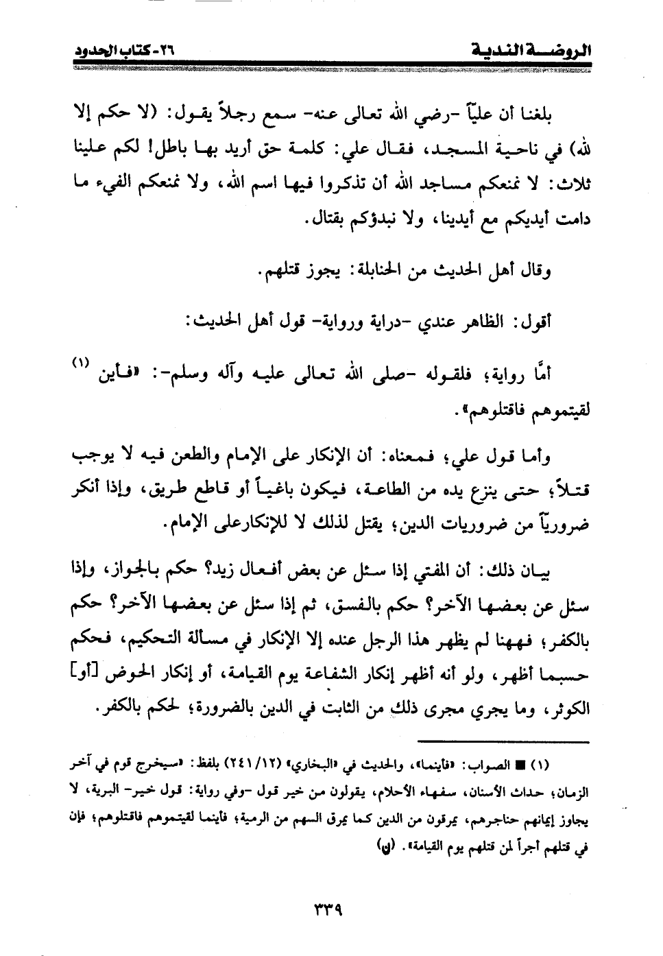 بلغنا أن عليا - رضي الله تعالى عنه - سمع رجلا يقول: (لا حكم إلا لله) في ناحية المسجد، فقال علي: كلمة حق أريد بها باطل! لكم علينا ثلاث: لا نمنعكم مساجد الله أن تذكروا فيها اسم الله، ولا نمنعكم الفيء ما دامت أيديكم مع أيدينا، ولا نبدؤكم بقتال.