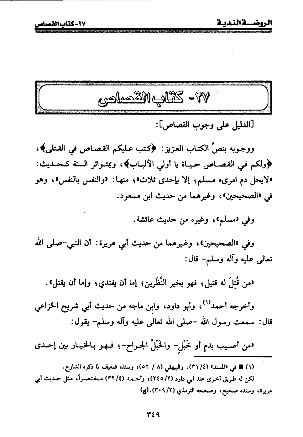 ووجوبه بنص الكتاب العزيز: {كتب عليكم القصاص في القتلى} ، {ولكم في القصاص حياة يا أولي الألباب} ، وبمتواتر السنة كحديث: " لا يحل دم امرئ مسلم؛ إلا بإحدى ثلاث "؛ منها: " والنفس بالنفس "، وهو في " الصحيحين "، وغيرهما من حديث ابن مسعود.