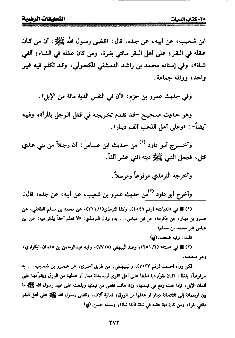 ابن شعيب، عن أبيه، عن جده، قال: " قضى رسول الله صلى الله عليه وسلم: أن من كان عقله في البقر؛ على أهل البقر مائتي بقرة، ومن كان عقله في الشاء؛ ألفي شاة "، وفي إسناده محمد بن راشد الدمشقي المكحولي، وقد تكلم فيه غير واحد، ووثقه جماعة.
