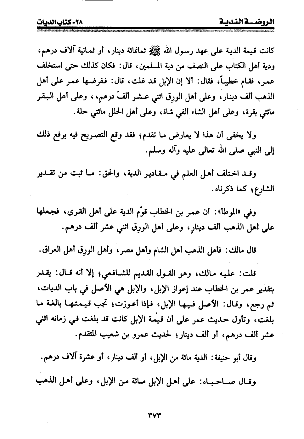 كانت قيمة الدية على عهد رسول الله صلى الله عليه وسلم ثمانمائة دينار، أو ثمانية آلاف درهم، ودية أهل الكتاب على النصف من دية المسلمين، قال: فكان كذلك حتى استخلف عمر، فقام خطيبا، فقال: ألا إن الإبل قد غلت، قال: ففرضها عمر على أهل الذهب ألف دينار، وعلى أهل الورق اثني عشر ألف درهم، وعلى أهل البقر مائتي بقرة، وعلى أهل الشاء ألفي شاة، وعلى أهل الحلل مائتي حلة.