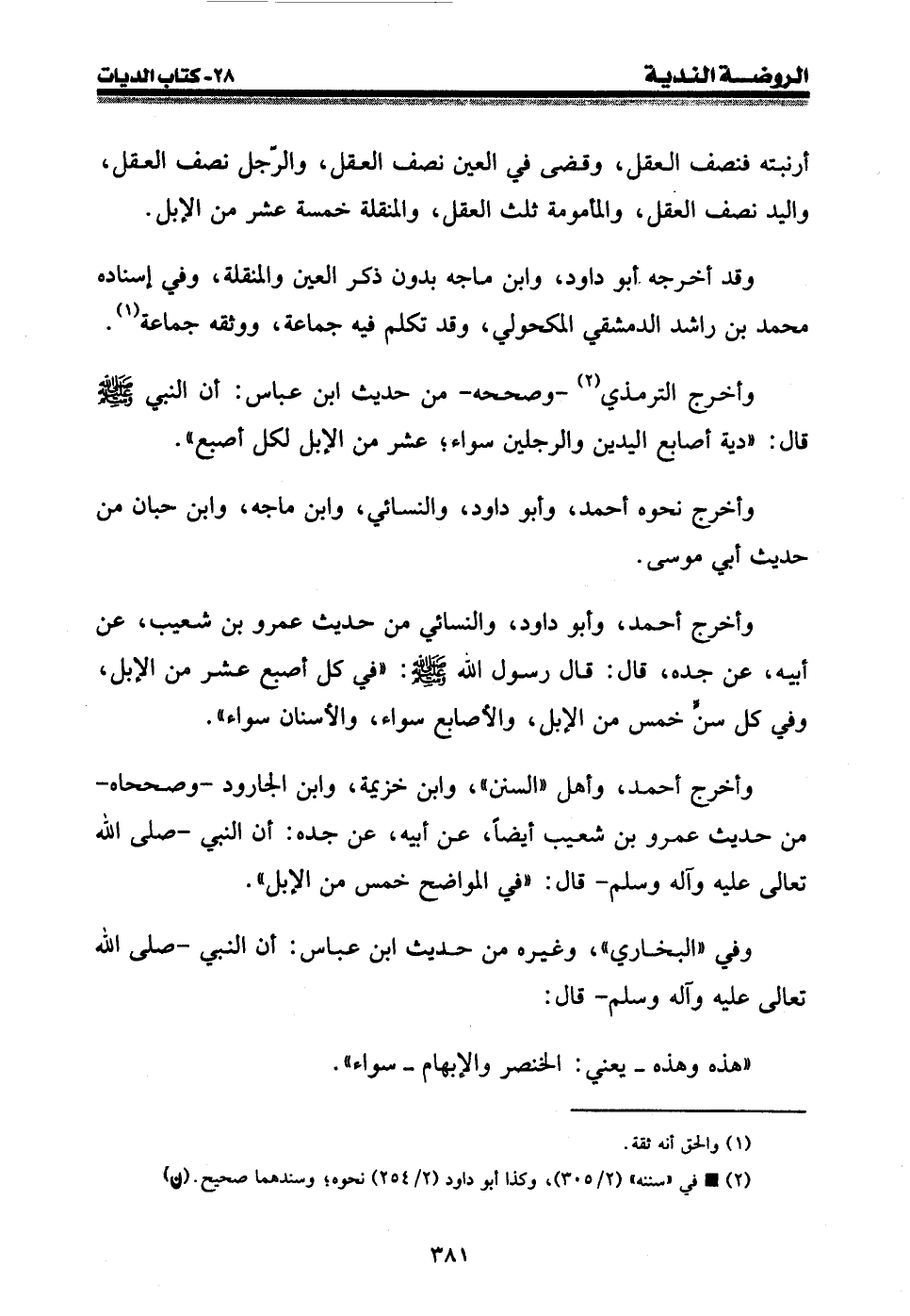 وأخرج أحمد، وأبو داود، والنسائي من حديث عمرو بن شعيب، عن أبيه، عن جده، قال: قال رسول الله صلى الله عليه وسلم: " في كل أصبع عشر من الإبل، وفي كل سن خمس من الإبل، والأصابع سواء، والأسنان سواء ".